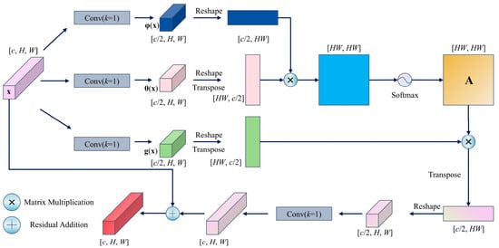The module first processes the input feature map x through three 1 × 1 convolutions to generate three feature projections, namely, θ(x), φ(x), and g(x), with the channel dimensions compressed to half of the original input to reduce computational complexity. Subsequently, a spatial similarity matrix is computed via matrix multiplication between θ(x) and φ(x) and normalized into attention weights A via Softmax. The weighted aggregation of A and g(x) produces globally contextualized features, which are then adjusted to match the channel dimensions via a 1 × 1 convolution and combined with the original input x through a residual connection, as expressed in Equation (3),