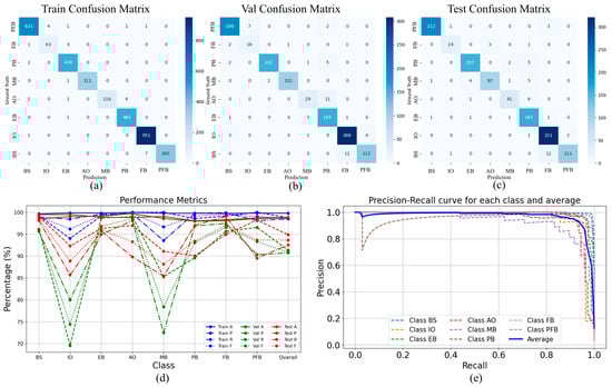 Figure 6. Confusion matrices and performance evaluation of the proposed FSCA-EUNet model across training, validation, and testing datasets. (a) Train Confusion Matrix; (b) Val Confusion Matrix; (c) Test Confusion Matrix; (d) Comparison of accuracy (A), precision (P), recall (R), and F1-score (F) for each class and overall across the three datasets; (e) PR curves for individual classes and the average performance.
