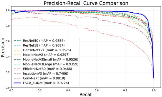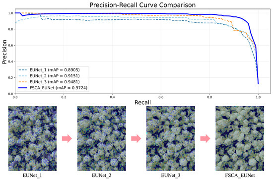 The PR curves of all models are shown in Figure 8. Analysis based on these curves reveals that the proposed FSCA-EUNet significantly outperforms the comparison models, with its curve closest to the upper-right corner, demonstrating sustained high precision at increased recall rates. This validates the effectiveness of the proposed network in balancing detection sensitivity and false positive suppression, thereby establishing it as the optimal solution for the target task.