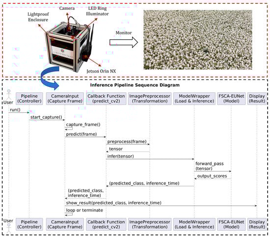 A corresponding sequence diagram further details the system workflow. The process begins with the user initiating the pipeline via the run() method of the pipeline controller. Subsequently, the CameraInput module activates and continuously captures frames from the camera. For each captured frame, the predict_cv2() callback function is invoked to perform inference. This function first preprocesses the frame using the ImagePreprocessor to convert raw image data into a suitable tensor format. The preprocessed tensor is then forwarded to the ModelWrapper, which executes the forward pass through the underlying neural network model(FSCA-EUNet). The predicted class along with the inference time is returned back through the call stack to the CameraInput module. Finally, the prediction results are displayed to the user in real-time, with the cycle repeating for subsequent frames until termination. The predicted results are simultaneously transmitted to the central control system. Once the system determines that the bloom stage is complete, the central controller automatically initiates the next step of transporting jasmine flowers to mix with tea leaves for scenting.