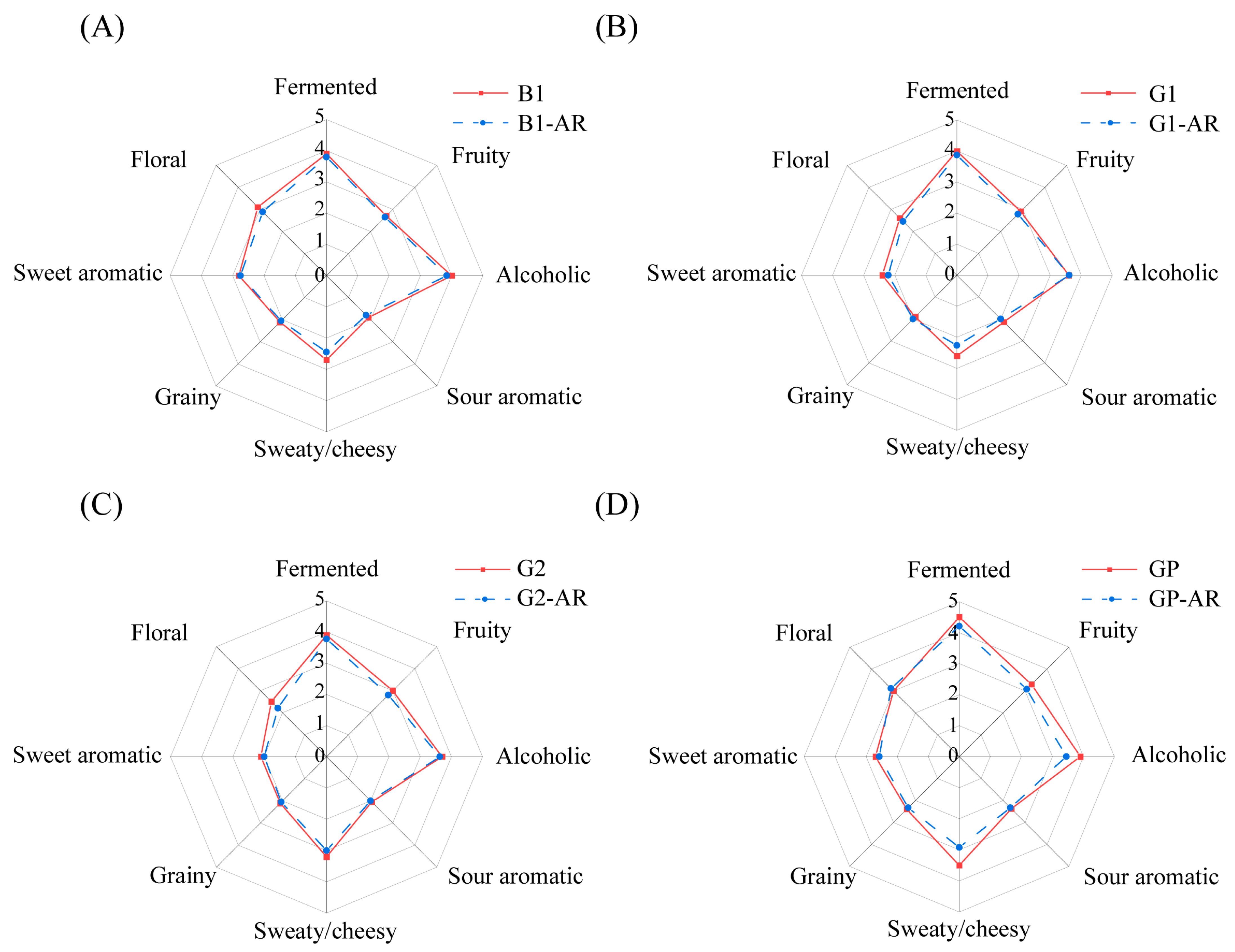 3.5. Key Aroma Compounds of NXB in Different Grades