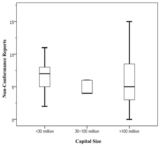 Number of NCRs by capital size in food businesses voluntarily applying for FSSMS certification program. Means sharing the same letter are not significantly different at the 5% significance level based on the Least Significant Difference test. Box plots display data from bottom to top as follows: minimum, first quartile, median, third quartile, and maximum.