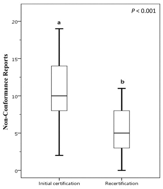 Number of NCRs among food businesses of different categories voluntarily applying for FSSMS certification. Different letters (a, b) indicate significant differences among the mean NCR values at the 5% level based on Duncan’s multiple range test. Box plots display data from bottom to top as follows: minimum, first quartile, median, third quartile, and maximum.