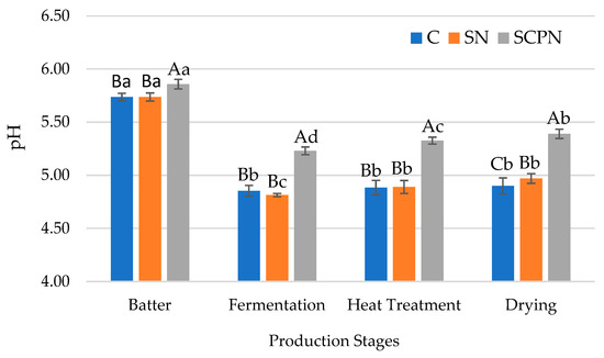 The effect of treatment × production stage interaction on pH value of HTS (C: Control, SN: Synthetic nitrite, SCPN: Swiss chard powder nitrite) (mean ± standard deviation) (n = 36) (p < 0.05). a–d: Different lowercase letters indicate significant differences between product stages for each treatment. A–C: Different uppercase letters indicate significant differences between treatments for each production stage.