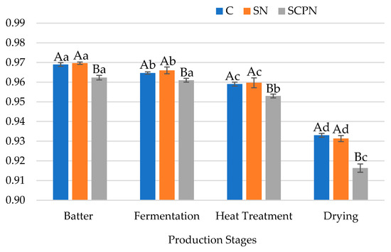 The effect of treatment × production stage interaction on aw value of HTS (C: Control, SN: Synthetic nitrite, SCPN: Swiss chard powder nitrite) (mean ± standard deviation) (n = 36) (p < 0.05). a–d: Different lowercase letters indicate significant differences between product stages for each treatment. A–B: Different uppercase letters indicate significant differences between treatments for each production stage.