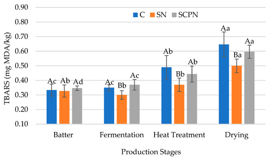 The effect of treatment × production stage interaction on TBARS value of HTS (C: Control, SN: Synthetic nitrite, SCPN: Swiss chard powder nitrite) (mean ± standard deviation) (n = 36) (p < 0.05). a–d: Different lowercase letters indicate significant differences between product stages for each treatment. A–B: Different uppercase letters indicate significant differences between treatments for each production stage.