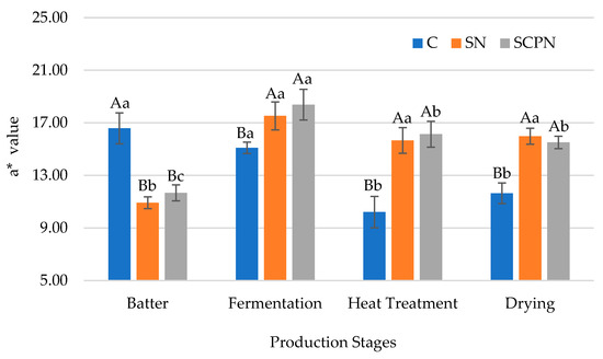 The effect of treatment× production stage interaction on a* value of HTS (C: Control, SN: Synthetic nitrite, SCPN: Swiss chard powder nitrite) (mean ± standard deviation) (n = 36) (p < 0.05). a–c: Different lowercase letters indicate significant differences between product stages for each treatment. A–B: Different uppercase letters indicate significant differences between treatments for each production stage.