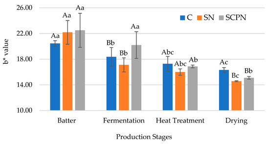 The effect of treatment × production stage interaction on b* value of HTS (C: Control, SN: Synthetic nitrite, SCPN: Swiss chard powder nitrite) (mean ± standard deviation) (n = 36) (p < 0.05). a–c: Different lowercase letters indicate significant differences between product stages for each treatment. A–B: Different uppercase letters indicate significant differences between treatments for each production stage.
