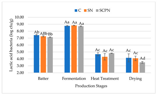 The effect of treatment × production stage interaction on lactic acid bacteria count of HTS (C: Control, SN: Synthetic nitrite, SCPN: Swiss chard powder nitrite) (mean ± standard deviation) (n = 36) (p < 0.05). a–c: Different lowercase letters indicate significant differences between product stages for each treatments. A–B: Different uppercase letters indicate significant differences between treatments for each production stages.