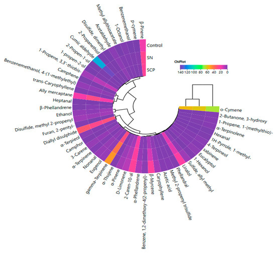Figure 7 presents a correlation heat map illustrating the relationships between the groups and volatile compounds. The analysis revealed differences among the groups, with the use of different nitrite sources resulting in the formation of two distinct clusters. The control group was separated from the nitrite-treated groups, whereas the SN and SCPN groups clustered together, exhibiting closer correlations. Additionally, it was observed that the use of different nitrite sources did not cause substantial differences in volatile compound profiles (Figure 7).