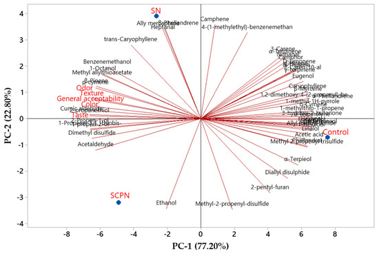 Principal component analysis (PCA) was conducted to assess the relationships among treatments, volatile compounds, and sensory attributes (Figure 8). The PC-1 explained 77.20% of the variation, and PC-2 explained 22.80% of the variation. The total variance was fully explained (100%) by the first two principal components. The SN and SCPN groups were on the negative side of PC-1 and showed a positive correlation. On the other hand, the control was on the positive side of PC-1 and showed a negative correlation with the SN and SCPN groups. The sensory parameters were located on the negative side of PC-1 and exhibited a positive correlation with the SN and SCPN groups. PCA results indicated that the SN and SCPN groups shared similar characteristics in terms of volatile compounds and sensory attributes.