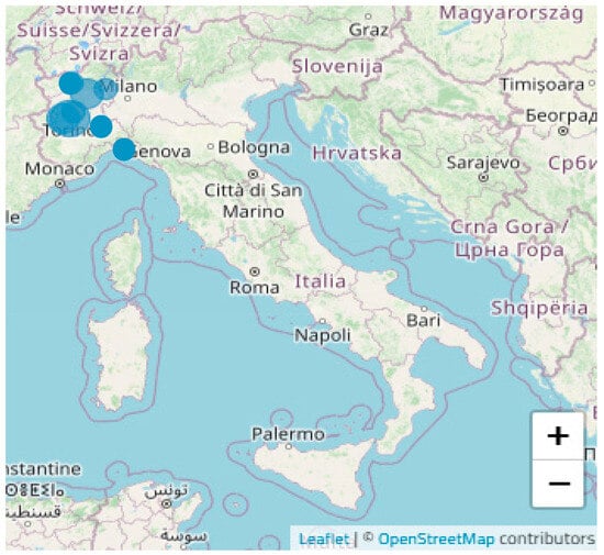 Geographical location of collected samples. The blue dots represent the areas where the samples were collected. This map was created by GenPat with Leaflet-powered OpenStreetMap [54].