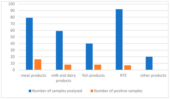 - Castrica, M.; Andoni, E.; Intraina, I.; Curone, G.; Copelotti, E.; Massacci, F.R.; Terio, V.; Colombo, S.; Balzaretti, C.M. Prevalence of Listeria monocytogenes and Salmonella spp. in Different Ready to Eat Foods from Large Retailers and Canteens over a 2-Year Period in Northern Italy. Int. J. Environ. Res. Public Health 2021, 18, 10568. [Google Scholar] [CrossRef]
