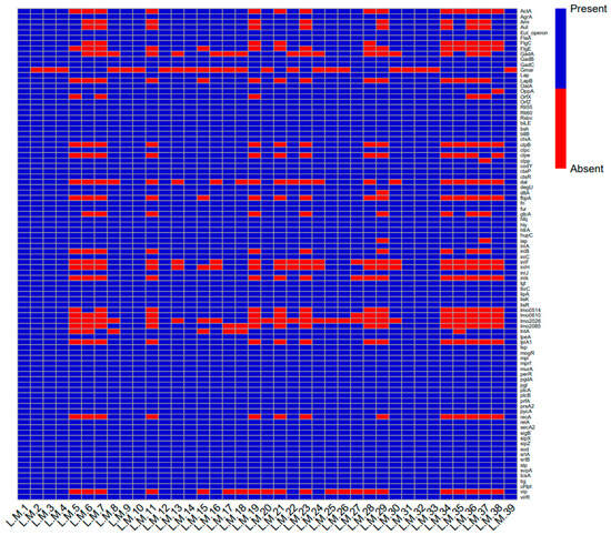 Heatmap of virulence genes in examined isolates. The presence of the gene is represented by blue boxes, while its absence is indicated by red boxes.