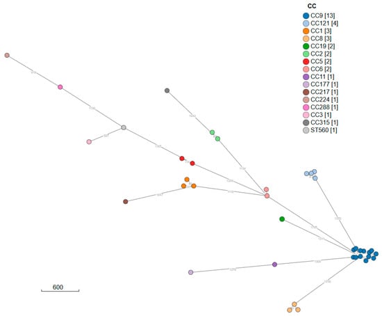 The minimum spanning tree (MS Tree), constructed through cgMLST analysis and visualized with the application SPREAD [56], highlights a major cluster (A) with 13 isolates, all belonging to CC9 (Figure 4).