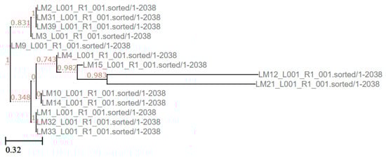 For cluster A, a phylogenetic tree was constructed using the distance matrix derived from the SNP analysis. As shown in Figure 5, the strains isolated from cluster A differ by between zero and 1375 SNPs (Appendix A Table A2). Only two samples have a SNP difference > 100 SNPs (LM 15 and LM 12). The LM 21 (isolate not related to cluster A) sequence has been used as an outgroup.