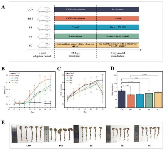 After a 7-day acclimatization period, the mice were randomly assigned to five treatment groups, each containing six mice: the healthy control group (CON), the model group (DSS), the regular fermented milk group (PS), the sea buckthorn fermented milk group (SS), and the sea buckthorn fermented milk with L. plantarum YHG-87 group (SC). The experiment lasted for 30 days. The CON and DSS groups were gavaged with 9% (w/v) saline, and the SC group were given a daily dose of 10 μL/g body weight, respectively. The modeling process began after 23 days of continuous gavage. A 3% (w/v) DSS solution was prepared in sterile water for modeling. The CON group continued to drink sterile water, while the other four groups received DSS solution. Simultaneously, the PS, SS, and SC groups continued their gavage treatments with the respective samples. The experiment concluded after 7 days of continuous gavage in all experimental groups (Figure 1A).