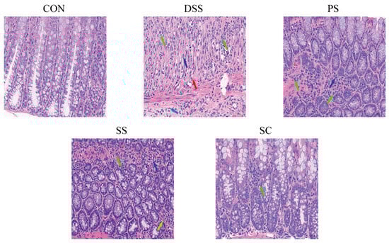 Sea buckthorn probiotic fermented milk administration protected against DSS-induced colon tissue damage (Hematoxylin and eosin staining microscopic images). Green, light blue, blue, red, and yellow arrows denote. neutrophils, lymphocytes, fibroblasts, new capillaries, and vascular congestion, respectively. (CON: the healthy control group, DSS: the model group, PS: the regularly fermented milk group, SS: the sea buckthorn fermented milk group, SC: the sea buckthorn with L. plantarum YHG-87 fermented milk group).