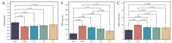 Effect of sea buckthorn probiotic fermented milk supplementation on oxidative stress marker. (A) Glutathione (GSH), (B) Myeloperoxidase (MPO) and (C) Malondialdehyde (MDA). Error bars represent standard deviation of the mean. Significant differences are represented by asterisks. (CON: the healthy control group, DSS: the model group, PS: the regular fermented milk group, SS: the sea buckthorn fermented milk group, SC: the sea buckthorn fermented milk with L. plantarum YHG-87 group).