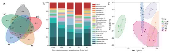 Effect of sea buckthorn probiotic fermented milk on the gut Microbiota composition. (A) The Venn network plot illustrates the common and unique microorganisms identified in comparisons among different groups. (B) Genus-level gut microbiota profile. (C) Principal coordinate analysis (PCoA; Bray–Curtis distance) score plot of mouse gut microbiota. (CON: the healthy control group, DSS: the model group, PS: the regular fermented milk group, SS: the sea buckthorn fermented milk group, SC: the sea buckthorn fermented milk with L. plantarum YHG-87 group).
