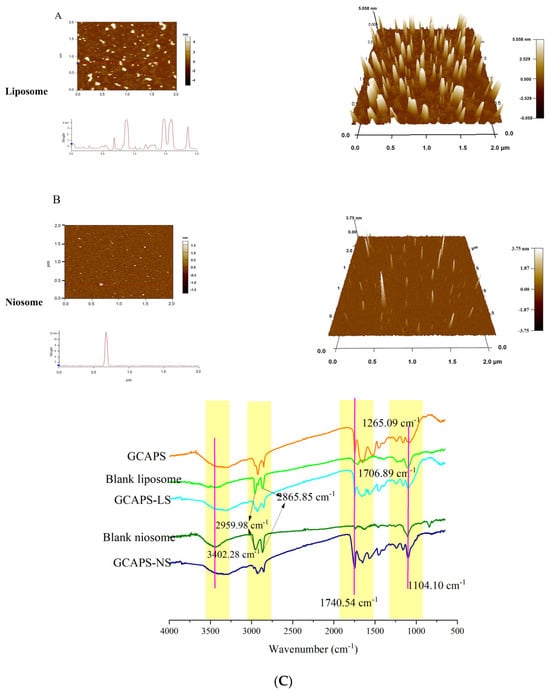FT-IR was further employed to investigate the interactions between GCAPS and the encapsulation system. As shown in Figure 2C, structural changes were observed after GCAPS encapsulation. In the GCAPS spectrum, the characteristic peaks at 3412 cm−1 and 2915.98 cm−1 corresponded to O-H stretching and symmetric -CH2 stretching vibrations, respectively. The blank liposomes and niosomes exhibited characteristic peaks at 2959.98 cm−1 and 2865.85 cm−1, which were attributed to β-sitosterol [1]. GCAPS displayed C=O stretching peaks at 1740 cm−1 and 1265 cm−1, with additional absorption bands at 1740 cm−1 and 1706 cm−1. For the liposomal formulations, the peak at 1740 cm−1 corresponded to ester C=O stretching in phospholipids, while the band at 1104 cm−1 was assigned to C-O stretching of Tween 40 [24]. The FT-IR spectra indicated slight structural alterations upon GCAPS encapsulation. In the GCAPS-loaded system, the peak intensity at 2865.85 cm−1 decreased, suggesting possible interactions between GCAPS and β-sitosterol that may facilitate encapsulation. Moreover, after GCAPS loading, minor shifts and intensity changes were observed in the amide I/II regions, indicating subtle alterations in the peptide microenvironment. The N-H stretching peak exhibited broadening and a slight red shift, suggesting hydrogen-bonding interactions between GCAPS and the lipid matrix, while minor changes in the C-H stretching region (~2850–2950 cm−1) indicated potential hydrophobic interactions. These interactions likely contributed to the successful encapsulation of GCAPS [14].