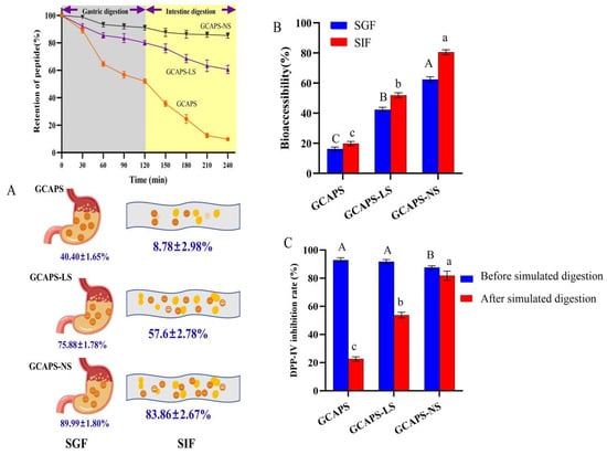 In vitro simulated release rate (A), bioaccessibility (B), and DPP-IV inhibition rates of GCAPS, GCAPS-LS, and GCAPS-NS before and after simulated gastric and intestinal digestion (C). (Different uppercase and lowercase letters indicate significant differences between groups. (p < 0.05). The data in the bar graphs are presented as mean ± standard deviation (SD).