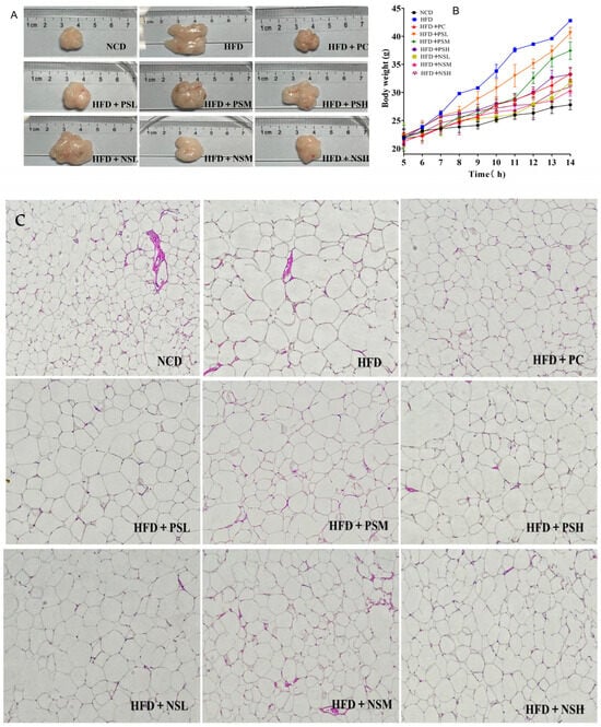 As shown in Figure 4A, epididymal adipose tissue from the HFD group exhibited significantly greater fat deposition compared to other groups. In addition, fat deposition in the GCAPS group was higher than that in the GCAPS-NS group, which might suggest that GCAPS-NS was more effective in reducing adiposity. The body weight gain curve further revealed a progressively widening gap between the HFD and the NCD group over time. Figure 4C showed that the HFD group exhibited substantial epididymal fat accumulation accompanied by enlarged adipocyte size. Compared with the HFD group, the GCAPS intervention group showed a modest reduction in adiposity. Specifically, mice in the HFD+NSM and HFD+NSH groups exhibited a marked decrease in adipocyte vacuolization.
