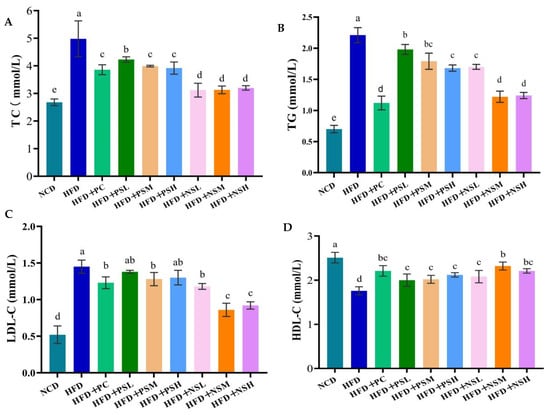 As shown in Figure 5A,B, HFD group significantly elevated serum TC and TG levels (p < 0.05). GCAPS and GCAPS-NS interventions significantly decreased TC levels (p < 0.05), with the greatest reduction observed in the HFD+NSM group. Compared with the HFD group, serum TC levels in the HFD+PC, HFD+PSL, HFD+PSM, HFD+PSH, HFD+NSL, HFD+NSM, and HFD+NSH groups were reduced by 22.48%, 15.06%, 19.88%, 21.28%, 38.15%, 39.36%, and 38.75%, respectively. Moreover, serum TG levels in these groups decreased by 49.32%, 10.41%, 19.00%, 23.98%, 23.08%, 44.79%, and 44.34%, respectively. The HFD group exhibited significantly elevated LDL-C levels compared to the NCD group (p < 0.05). However, intervention with PC, GCAPS, or GCAPS-NS significantly reduced LDL-C levels (p < 0.05), with the largest decrease observed in the HFD+NSM group. Moreover, HFD feeding significantly decreased HDL-C levels, whereas interventions with PC, GCAPS, or GCAPS-NS significantly increased HDL-C levels (p < 0.05) (Figure 5C,D). These results suggested that GCAPS-NS effectively improves lipid metabolism and alleviates hepatic damage induced by long-term high-fat diet consumption.