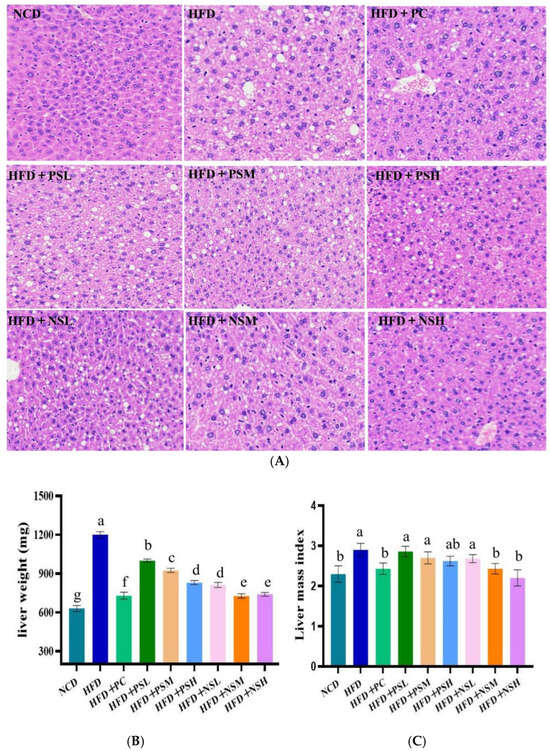 Liver weight and index were lower in the NCD group than in the HFD group, suggesting that the latter experienced more severe hepatic lipid accumulation and injury. These findings suggested that GCAPS-NS effectively protected GCAPS from degradation and enhanced its biological efficacy in vivo. In addition, liver weight and index were significantly reduced in the NCD group relative to the HFD group, indicating that HFD consumption induced hepatic lipid accumulation and injury. After interventions with PC, GCAPS, and GCAPS-NS, hepatic fat accumulation was significantly reduced, especially in the PC and GCAPS-NS groups (Figure 6B). Compared to the HFD group, GCAPS treatment moderately reduced the liver index, whereas all GCAPS-NS intervention groups attenuated hepatic injury, with no significant differences observed between the HFD+NSM, HFD+NSH, and PC groups (Figure 6C).