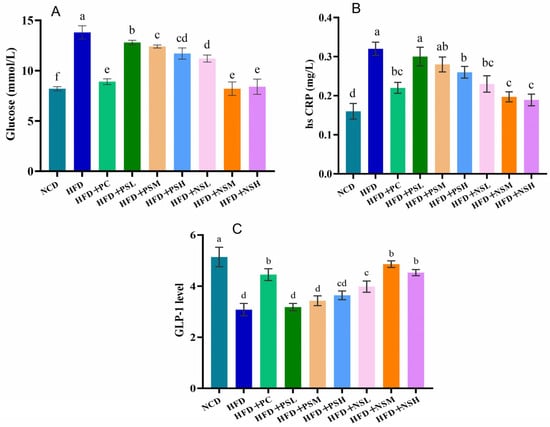 Effects of GCAPS and GCAPS-NS on mouse serum glucose, hsCRP and GLP-1 level (A–C). Different lowercase letters indicate significant differences between groups (p < 0.05). The data in the bar graphs are presented as mean ± standard deviation (SD).