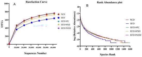 As shown in Figure 9A, the rarefaction curves of all five groups approached a plateau with increasing sequencing depth, suggesting sufficient coverage for robust microbial diversity assessment. The rank abundance curves further demonstrated broadly and evenly distributed microbial communities across all groups, except for the HFD group, in which a steep decline in the curve indicated a marked reduction in species richness and evenness (Figure 9B). These results indicated that HFD significantly impaired gut microbial diversity and structure. Venn diagram analysis revealed 802 shared OTUs across the five groups, with the HFD+PC (177) and HFD+NSM (162) groups showing the greatest uniqueness, suggesting improved microbial diversity following intervention (Figure 10A). Compared to the NCD group, the HFD group exhibited significantly reduced ACE, Chao1, Simpson, and Shannon indices (p < 0.05), suggesting that HFD impaired microbial richness and diversity [24]. However, the Shannon index was significantly increased in the HFD+PC and HFD+NSM groups, approaching the levels observed in the NCD group (Figure 10B–E. PCoA and NMDS analyses illustrated significant divergence in microbial profiles between HFD-fed mice and those receiving dietary interventions [25]. Among them, the HFD+NSM group exhibited a distinct shift away from the HFD group along both the PCoA (PC1 and PC2) and NMDS (MDS1 and MDS2) dimensions, with its microbial profile clustering more closely with that of the NCD group (Figure 10F,G. These findings suggested that PSH and NSM interventions modulated the gut microbiota composition in the context of HFD-induced dysbiosis, with HFD+NSM exhibiting a more pronounced regulatory effect.