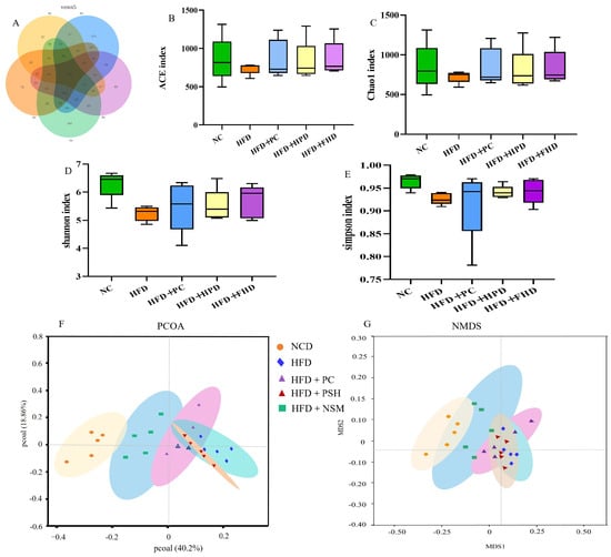 The intestinal microbes of mice in each group. Venn diagram of gut microbiota OTUs in the blank control (NCD), high-fat diet (HFD), positive control (HFD+PC), high-dose peptide group (HFD+PSH), and medium-dose peptide liposome group (HFD+NSM) (A); ACE index (B); Chao index (C); Shannon index (D); Simpson index (E); PCOA scatter diagram (F); NMDS scatter diagram (G). For panels (B–G), n = 5 mice per group. Statistical analysis was performed using one-way ANOVA followed by Tukey’s post hoc test.
