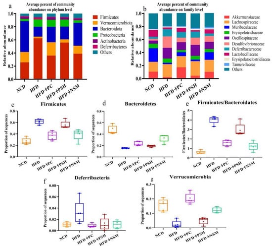 Microbial imbalance in the gut has been closely related to the development of metabolic diseases, including diabetes [26]. As shown in Figure 11a, HFD led to reduced abundance of Bacteroidetes and Verrucomicrobia, and elevated levels of Firmicutes and Desulfovibrionaceae, compared to the NCD group. At the phylum level, Firmicutes and Bacteroidetes comprised the principal bacterial phyla observed across all groups (Figure 11b). In the NCD group, Bacteroidetes was predominant, whereas Firmicutes became the dominant phylum in the HFD group. It was observed that HFD feeding led to an enrichment of Firmicutes and Proteobacteria, while reducing that of Bacteroidetes and Verrucomicrobia. Compared with the HFD group, the HFD+PC, HFD+PSH, and HFD+NSM intervention groups exhibited a reduced Firmicutes dominance and a higher proportion of Bacteroidetes. At the family level, the NCD group was dominated by Akkermansiaceae, Muribaculaceae, Lachnospiraceae, and Lactobacillaceae. Akkermansiaceae abundance was significantly elevated in both the HFD+PC and HFD+NSM groups. Moreover, all three intervention groups alleviated gut microbial dysbiosis associated with insulin resistance by reducing the Firmicutes/Bacteroidetes ratio (Figure 11c–g). Among them, the HFD+NSM group exerted the most pronounced modulatory effect [27].