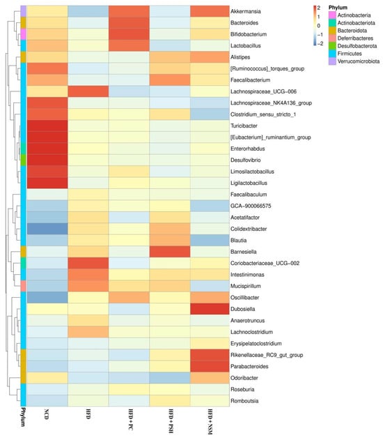Figure 12 showed that the NCD group exhibited increased levels of functionally beneficial genera, including Lachnospiraceae_NK4A136_group, Limosilactobacillus, and Turicibacter, which contribute to metabolic regulation, immune enhancement, and fermentation [28,29,30]. In the HFD group, the abundances of Lachnoclostridium, Mucispirillum, and Intestinimonas were increased, suggesting that the high-fat diet induced gut microbiota dysbiosis. Following intervention, the abundances of Akkermansia, Bacteroides, and Bifidobacterium were increased in the HFD+PC and HFD+NSM groups. Among these, Akkermansia was known to improve insulin resistance and modulate immune responses [31]. The HFD+NSM group was also enriched in beneficial genera such as Parabacteroides and Dubosiella, among which Parabacteroides has been negatively associated with metabolic disorders [32]. In addition, the HFD+PSH group exhibited elevated levels of SCFA-producing microbes, including Barnesiella and Faecalibacterium. The HFD+PC, HFD+PSH, and HFD+NSM interventions all alleviated HFD-induced gut microbiota dysbiosis, with the HFD+NSM group exhibiting the most pronounced regulatory effect, potentially contributing to the maintenance of glucose homeostasis.