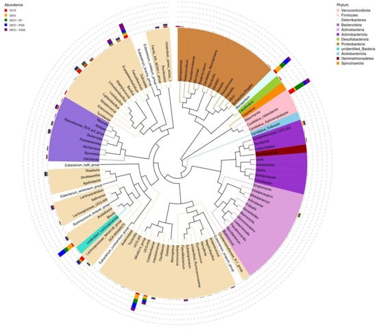Phylogenetic relationships of gut microbiota at the genus level in mice from different sample intervention groups. Different colors represent different phylum-level classifications.