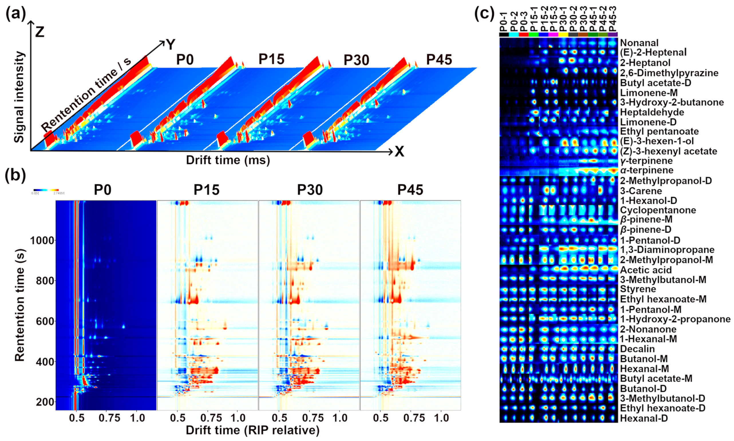 - Zhao, X.; Feng, J.; Laghi, L.; Deng, J.; Dao, X.; Tang, J.; Ji, L.; Zhu, C.; Picone, G. Characterization of Flavor Profile of “Nanx Wudl” Sour Meat Fermented from Goose and Pork Using Gas Chromatography–Ion Mobility Spectrometry (GC–IMS) Combined with Electronic Nose and Tongue. Foods 2023, 12, 2194. [Google Scholar] [CrossRef]