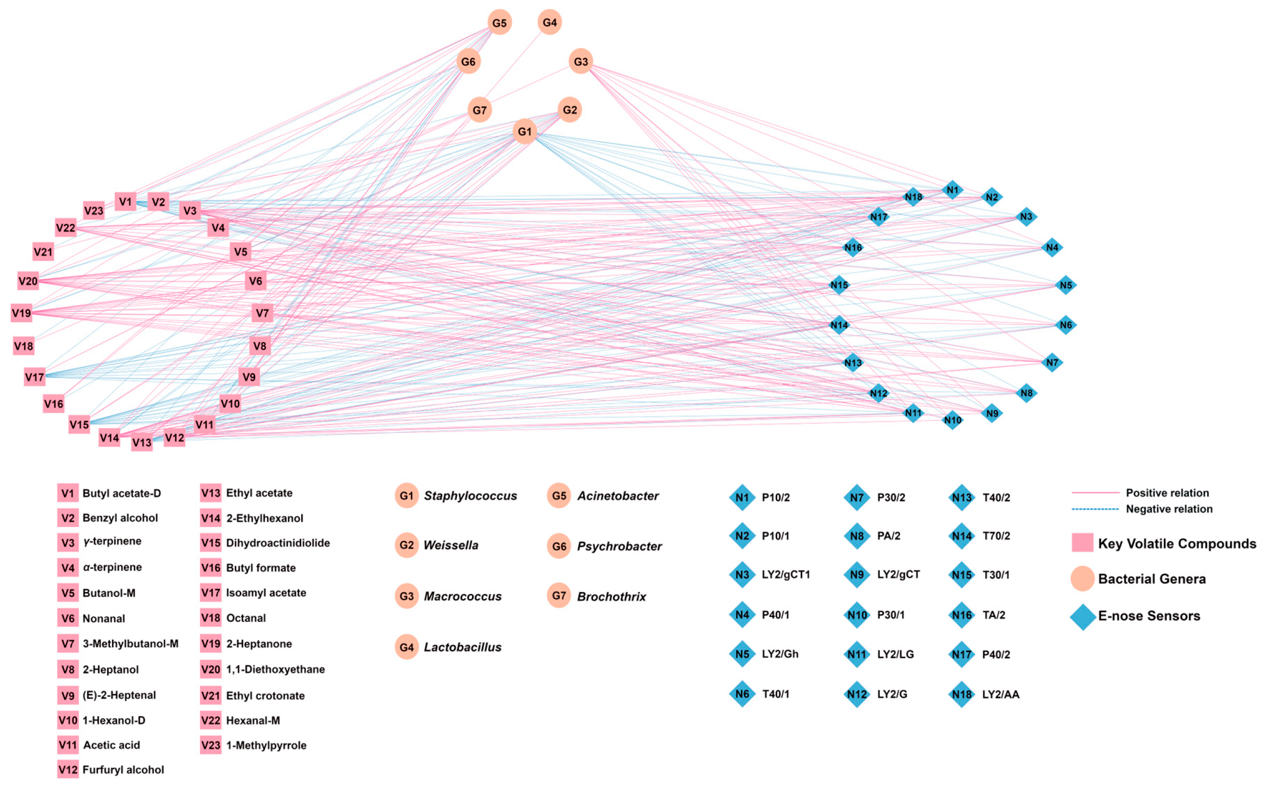 3.4. Correlation Analysis of Bacterial Genera, Key Volatile Compounds, and E-Nose Sensors