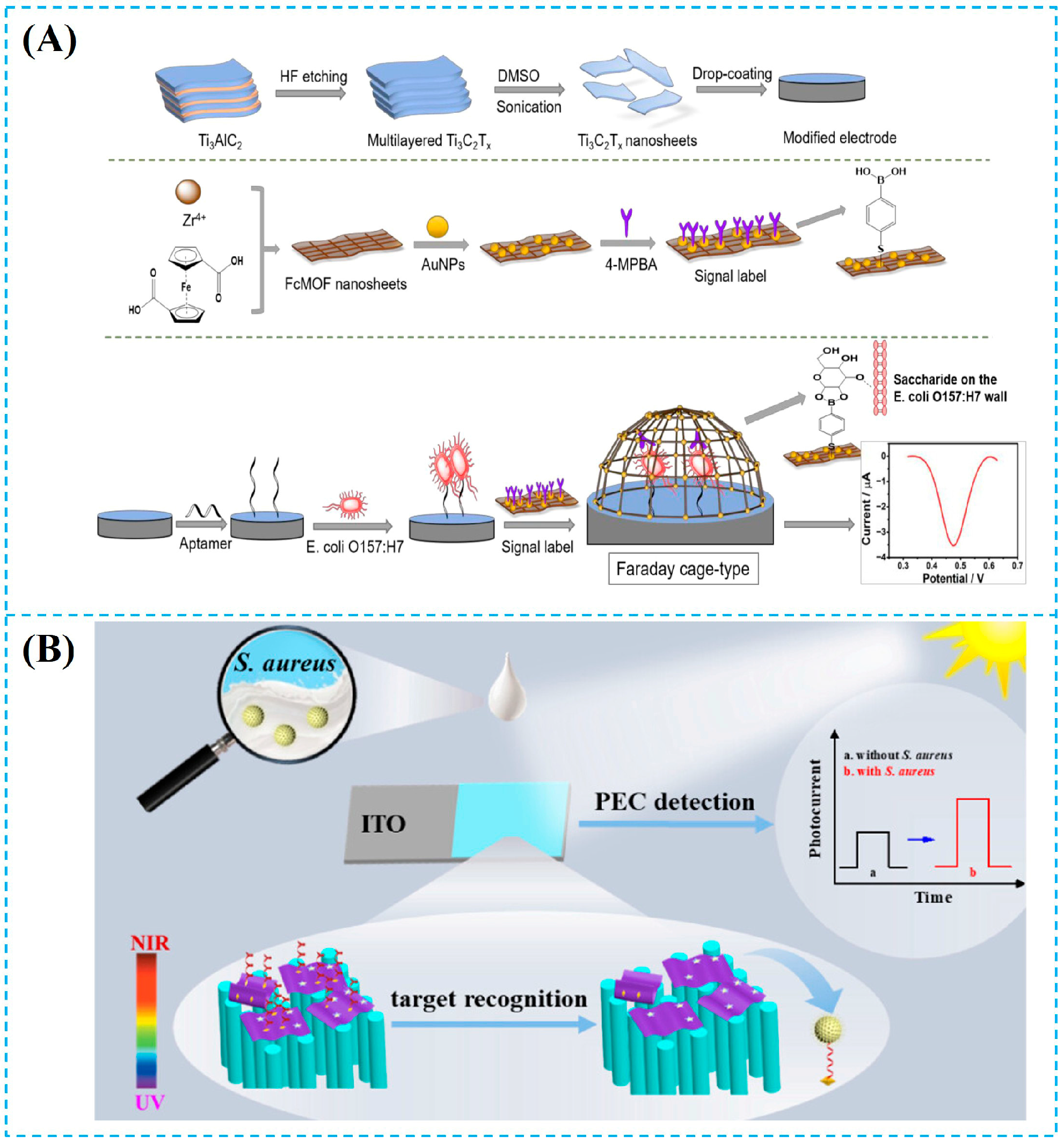 - Huang, A.; Dong, X.; Shen, G.; He, L.; Cai, C.; Liu, Q.; Niu, Q.; Xu, C. Target Recognition-Triggered Interfacial Electron Transfer Model: Toward Signal-On Photoelectrochemical Aptasensing for Efficient Detection of Staphylococcus aureus Using Ti3C2Tx-Au NBPs/ZnO NR Composites. Langmuir 2024, 40, 20526–20536. [Google Scholar] [CrossRef]