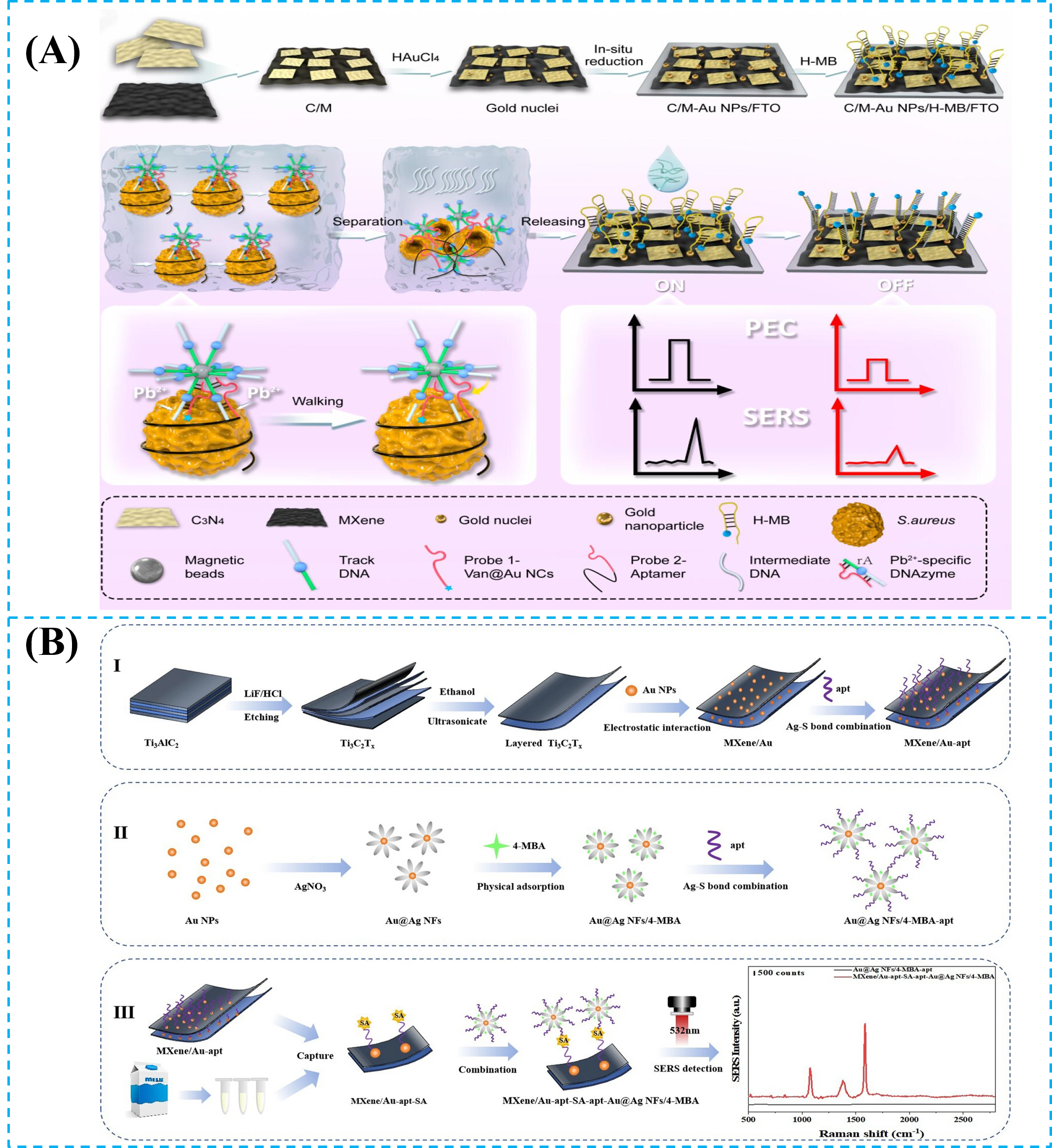 - Qu, Q.; Li, Q.; Xiao, X.; Zhu, K.; Gao, W.; Wang, Q.; Wu, W. Dual-plasmonic metals functionalized MXene synergistic enhanced SERS biosensor for sensitive and selective detection of S. aureus in milk. Microchim. Acta 2025, 192, 620. [Google Scholar] [CrossRef]
