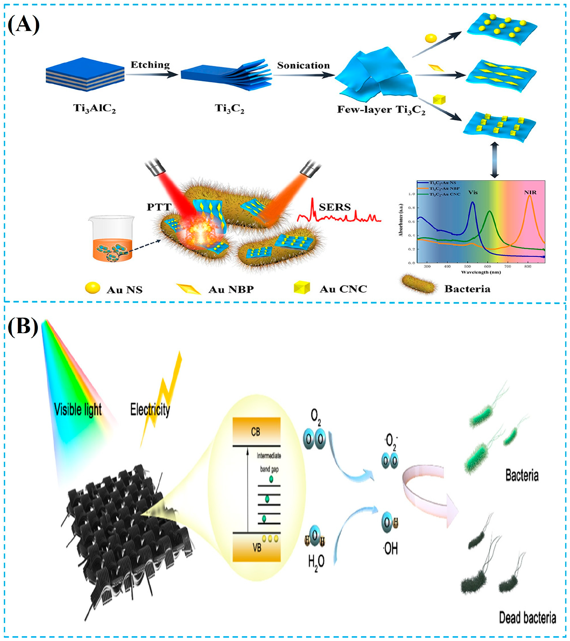 - Zhao, W.; Jiang, L.; Pan, W.; Li, D.; Duan, M.; Zhou, Y.; Chen, L. V2CTx-Au Nanostructures for Rapid Surface-Enhanced Raman Scattering Detection of Bacteria and Synergistic Photothermal/Photodynamic Therapy. ACS Appl. Nano Mater. 2024, 7, 14673–14683. [Google Scholar] [CrossRef]