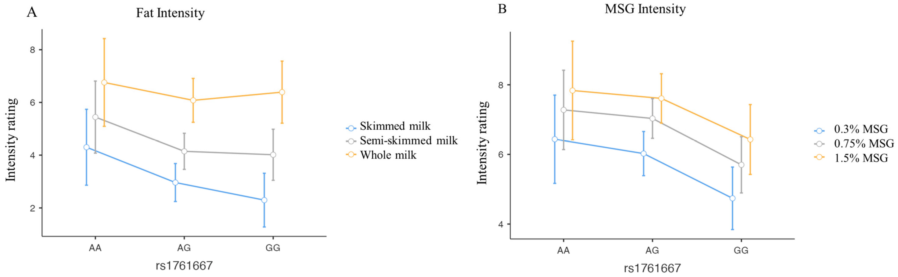 4.2. CD36 rs1761667 and Food Sample Perception in Study 2