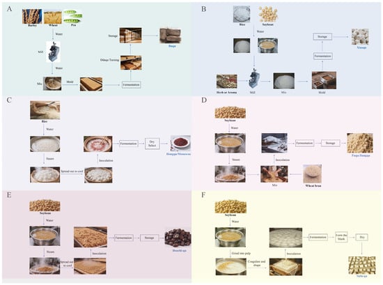 Schematic of qu-making processes and process engineering. Panels (A–F) were daqu, xiaoqu, hongqu (Monascus), fuqu/jiangqu, and sufu-qu.