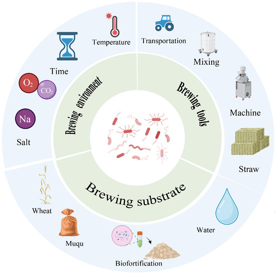 - Zhang, P.; Liu, Y.; Li, H.; Hui, M.; Pan, C. Strategies and Challenges of Microbiota Regulation in Baijiu Brewing. Foods 2024, 13, 1954. [Google Scholar] [CrossRef] [PubMed]