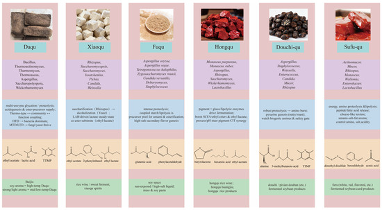 As shown in Table 1 and Figure 2, the community structures of the various starter cultures were shaped by environmental filtering dominated by heat history, substrate, and salinity, and were coupled to flavor formation and quality stability through a spatiotemporal relay of enzyme production and conversion. In summary, the temperature type of daqu acted as the primary constraint on assembly and functional differentiation. High-temperature daqu enriched Firmicutes and thermotolerant fungi under heat pulses and drove protein and polysaccharide cleavage and pyrazine-related metabolism, whereas low-temperature daqu favored a mild platform of yeasts and lactic acid bacteria, reflecting an ecology guided by thermal history. Xiaoqu formed a compact triad composed of Rhizopus, Saccharomyces, and lactic acid bacteria that rapidly completed the relay from saccharification to ethanol production and acidification. Hongqu was centered on Monascus, which regulated pigment and polyketide networks through secondary-metabolism gene clusters and interacted with yeasts over time. The soy sauce system exhibited a two-stage relay in which the koji stage supplied enzymes and the moromi stage selected salt-tolerant metabolism, with Tetragenococcus and Zygosaccharomyces gaining ecological advantage under high salt to drive acidification and the formation of key flavor precursors. Douchi and sufu showed, respectively, typified assembly and a cooperative path in which molds laid the foundation and bacteria followed, thereby completing a continuous ecological design from the initial starter to late maturation.