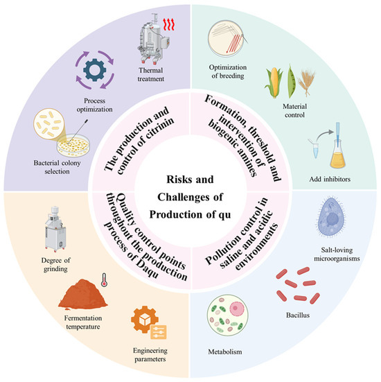 Against this background, this review aimed to address three focused research questions. The first concerned process engineering. Raw material types such as wheat, barley, pea, rice or rice flour, and bran, together with forming and drying methods, moisture and aeration settings, and stacking thickness, jointly shaped the pore structure and the regimes of heat and mass transfer in qu, which defined enzyme profiles and subsequent fermentation kinetics. The second concerned community ecology. Thermal types and environmental factors drove assembly and functional divergence of mixed microbial communities, which mapped through enzyme substrate microbe coupling to flavor chemistry routes. The third concerned food applications and quality and safety. The functional positions of different qu in alcoholic beverages, sauces, vinegars, and soy-based products, together with key control points QCP and risk factors such as Monascus-related mycotoxin citrinin and biogenic amines, formed a closed loop from identification to intervention. Based on these three questions, this review integrated the four dimensions of process, microecology, flavor, and quality into a testable research framework intended to support the transition from artisanal practice to industrialization and intelligent manufacturing. At the academic level, this work juxtaposed SSF engineering with community ecology and flavor omics to rebuild the evidence chain from variables and mechanisms to phenotypes and to provide material for causal models linking qu functions, fermentation performance, and product flavor. At the industrial level, this work focused on implementable parameters and indicator systems such as moisture and aeration-linked temperature trajectories, enzyme intensities, yields of flavor precursors, and sensory readouts for standardized qu making, cross-site consistency, and development of greener products with reduced salt and sugar.