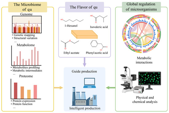 Within a modern fermentation science framework, qu was redefined as an engineered natural bioreactor. Under solid-state conditions with controlled moisture and convective heat transfer, community assembly and succession created multi-enzyme networks for substrate conversion. These networks supplied fermentable sugars, amino acids, and fatty acids from macromolecular substrates and drove the production of ethanol and flavor compounds [5,6,7]. Major Chinese fermented categories including Baijiu, Huangjiu, vinegar, soy sauce, soybean pastes, and soy-based products all built the first principles of flavor and structure from qu as the starting point [8]. Reviews from flavor chemistry and microbial ecology jointly argued that qu served as the vehicle for optimal microbial collaboration in traditional fermented foods such as Baijiu. Its enzyme profiles and metabolic routes determined sensory trajectories and quality stability in both alcoholic and non-alcoholic products [9,10,11,12,13]. Traditional workshops had long relied on artisanal know-how to adjust qu making such as particle size of raw materials, water addition, stacking thickness, turning points, and aeration. Under open natural inoculation, batch variability and regional effects were pronounced, which hindered consistent outputs across workshops, seasons, and sites [2,10,14,15]. Over roughly the past decade [3,11,15,16], research on qu moved from experience to measurable and model-based fermentation engineering. Heat and mass transfer in SSF acted as the nexus for advances in raw material pretreatment, online process profiling, data-driven modeling, and equipment upgrades such as intelligent qu rooms with closed-loop control of temperature, humidity, and airflow. This engineering perspective provided the methodological basis for the modern redefinition of qu [17,18,19,20]. At the frontier of microbiology [21], qu was not a static set of strains but a self-organized microecology driven by temperature trajectories, moisture, and oxygen transfer [9,10,12,13,22,23]. Multi-omics studies demonstrated thermal stratification in high, medium, and low temperature types and spatiotemporal heterogeneity during preparation and storage. Core functional guilds and metabolic routes diverged accordingly [24]. Paradigms such as qu omics connected assembly rules and metabolic phenotypes with process variables, which supplied a coherent chain of evidence for functional customization, standard evaluation, and quality traceability of qu [2,3,25,26,27,28,29].