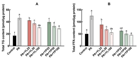 Effects of yomogi tea on cellular lipid accumulation in HK-2 cells. Cellular TG content (A). Cellular FFA content (B) was measured by LC–MS after 24 h treatment with PA (200 µM) and YL/YP (25, 50, and 100 µg/mL). Control: the vehicle-treated group containing 0.2% BSA and 0.02% ethanol. Data are presented as mean ± SD (n = 4). Values with different letters are significantly different (p < 0.05). Different colors indicate different treatment groups.