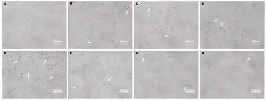 Representative images of oil red O staining showing LD accumulation in HK-2 cells treated with PA (200 µM) and YL/YP (25, 50, and 100 µg/mL) for 24 h. (A): Control; (B): PA + YL25; (C): PA + YL50; (D): PA + YL100; (E): PA; (F): PA + YP25; (G): PA + YP50; (H): PA + YP100. White arrows indicate representative LDs. Scale bar: 100 µm.