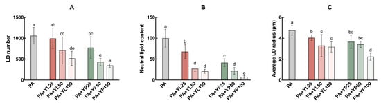 In terms of average LD radius (Figure 4C), the PA-treated group exhibited the largest LDs with an average radius of 4.75 ± 0.47 µm. Increasing concentrations of YL and YP led to a significant reduction in LD size in a dose-dependent manner. The average LD radius decreased to 3.17 ± 0.50 µm in the YL group at 100 µg/mL, whereas the same concentration of YP further reduced the radius to 2.24 ± 0.34 µm, highlighting YP’s slightly stronger ability to decrease LD size.