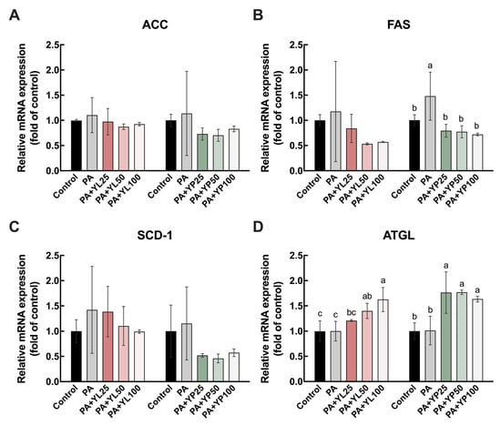 Effects of yomogi tea on the mRNA expression of lipid-metabolism-related genes in HK-2 cells. Cells were treated with PA (200 µM) and YL/YP (25, 50, and 100 µg/mL) for 24 h. Relative mRNA expression levels of ACC (A), FAS (B), SCD-1 (C), and ATGL (D) were normalized to GAPDH and are shown as fold change versus control. Data are presented as mean ± SD (n = 3). Values with different letters are significantly different (p < 0.05). Different colors indicate different treatment groups.